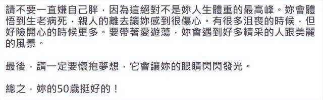 50岁生日那年,钟欣凌写信告诉20岁时的自己,她说:请不要一直嫌自己胖,请一定要怀抱梦想。
